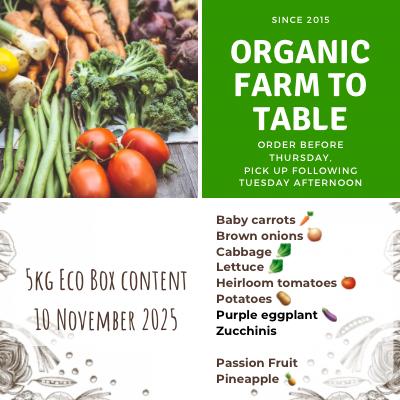 The 5kg Eco bag is the result of the request of quite a few of our members: people who want to make sure they pollute as little as possible when feeding their families with organic fruit and vegetables. Thus, 100% of this bag's content comes from "nearby" organic farms in Malaysia or Thailand. Everything is trucked in, nothing comes by plane.