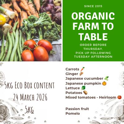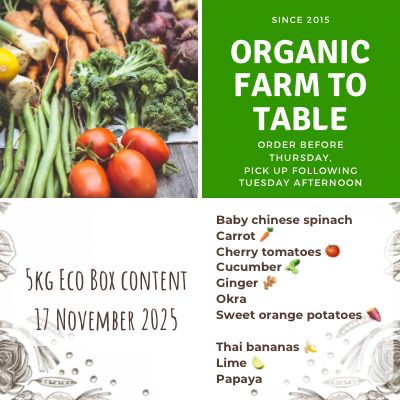 The 5kg Eco bag is the result of the request of quite a few of our members: people who want to make sure they pollute as little as possible when feeding their families with organic fruit and vegetables. Thus, 100% of this bag's content comes from "nearby" organic farms in Malaysia or Thailand. Everything is trucked in, nothing comes by plane.